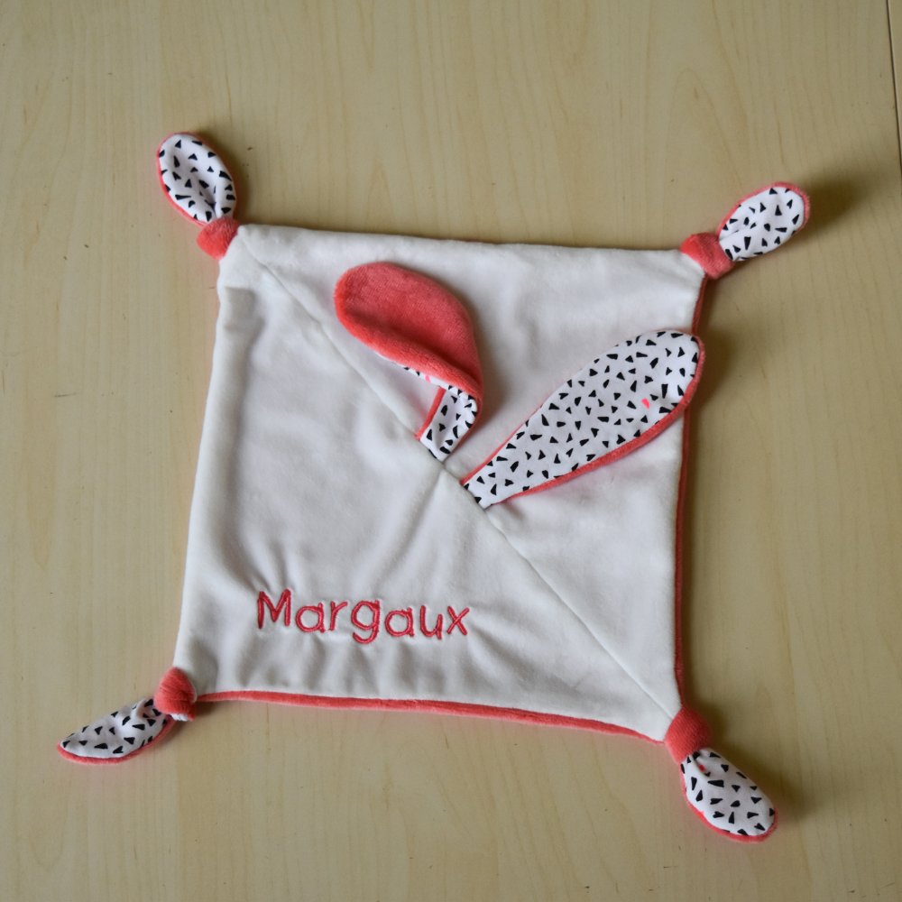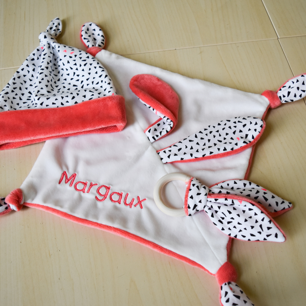 La première, oui oui, la première fille (depuis ma propre fille) après une belle brochette de garçons… Autant dire qu’on l’attendait avec impatience ! Du corail, du peps… Je ne savais pas que cela la définirait à ce point ! 😅 J’ai trouvé un joli jersey blanc et noir avec une touche de rose fluo chez Créacorner, et le tissu tout doux au marché du tissu. ❤️ J’ai choisi de coudre un petit bonnet, un hochet tout doux et un doudou personnalisé. Le modèle du petit bonnet vient d’un hors-série Burda : le Burda Baby de 2018. Le hochet est un patron maison, largement inspiré de mes trouvailles sur Instagram et Pinterest. Après tout, il faut bien que les nombreuses heures passées à procrastiner sur les réseaux servent à quelque chose ! 😇 Pour le doudou, je savais déjà que je choisirais l’une des jolies créations de Petits D’om. Mon choix s’est porté sur le doudou Lapinou, disponible en PDF. À l’époque, il n’existait qu’avec des oreilles de lapin, mais sachez qu’il est maintenant possible de le réaliser avec 12 sortes d’oreilles différentes ! Ce modèle est très facile à coudre et permet d’y broder facilement un prénom ou d’y insérer des petites étiquettes supplémentaires sur les côtés. On a d’ailleurs attendu avec impatience la naissance de cette petite poulette pour connaître son prénom. Un passage sous la brodeuse, quelques coutures à la machine plus tard… et son doudou était prêt ! Ce qui est sûr c’est que c’est trop trop mignon 🥰 A très vite! Bisous 😘