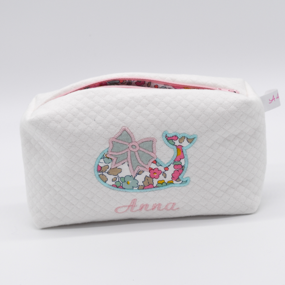 Ensuite, parce que son frère en avait eu une, avec lui aussi, sa petite baleine 🐳 🩵 (à revoir, ICI) et que ma brodeuse était fin prête à refaire ce cétacé adorable en appliqué qui semble presque nager sur le tissu.