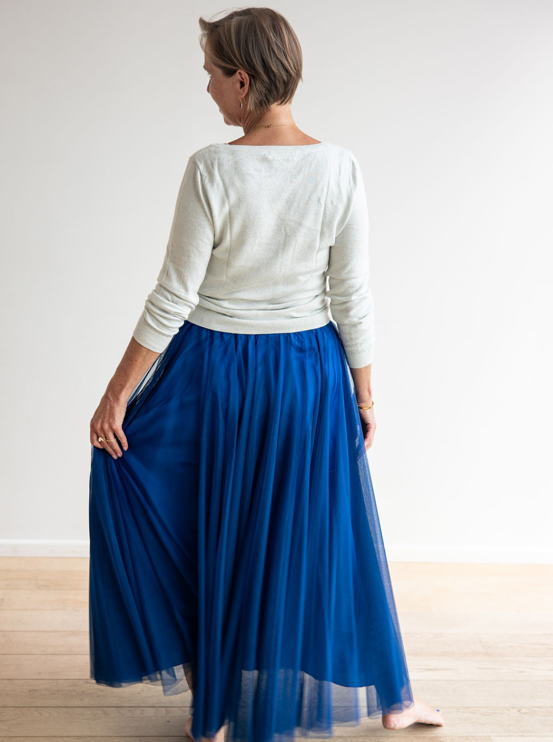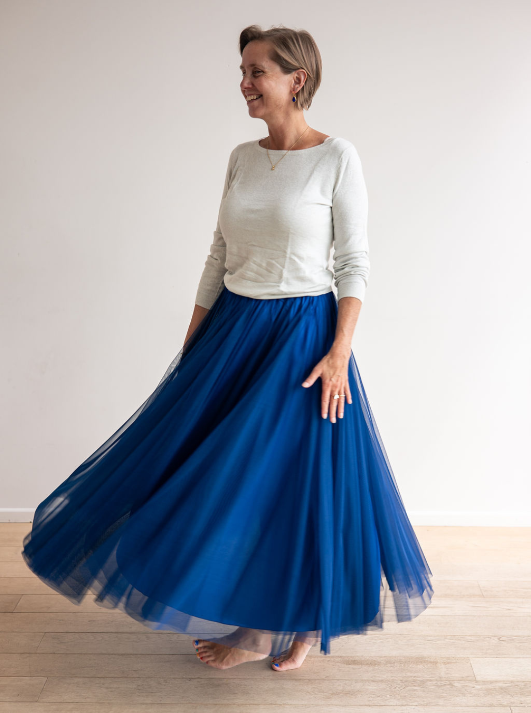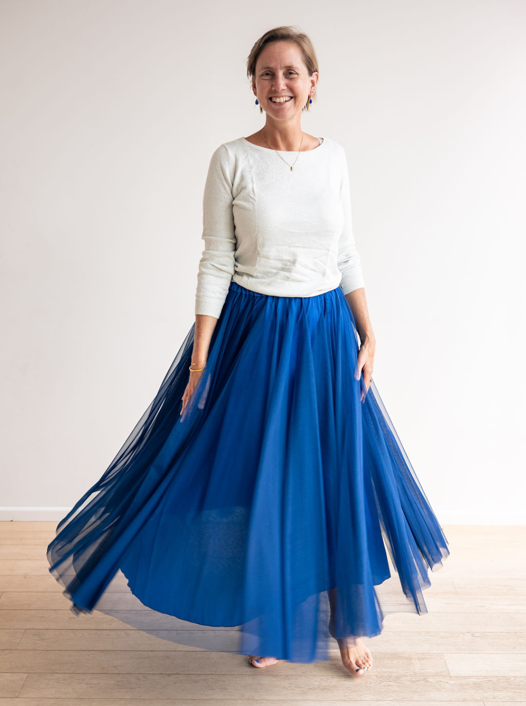 En examinant le modèle de plus près, j’ai été agréablement surprise. La créatrice avait pensé à tout ! Même avec 12 mètres de tulle (oui, vous avez bien lu, 12 mètres !), le patron était conçu pour réduire tout cet excès à un tour de taille bien ajusté, sans donner l’impression que mes fesses aient pris 15 kg rien qu’à l’enfilage.